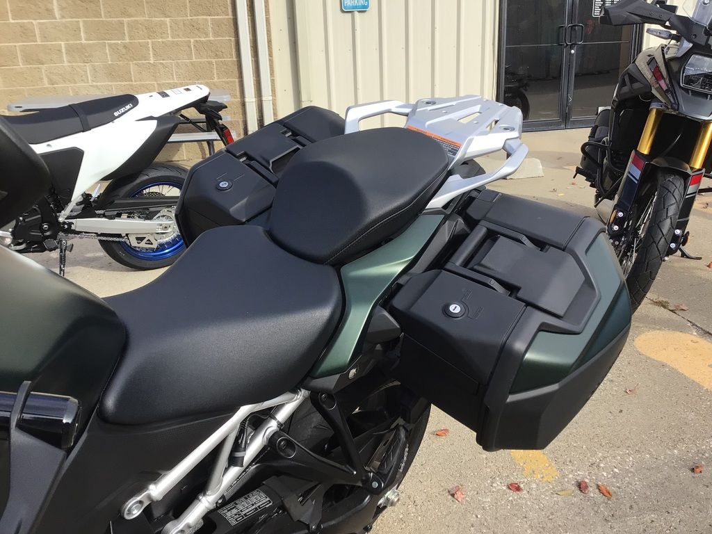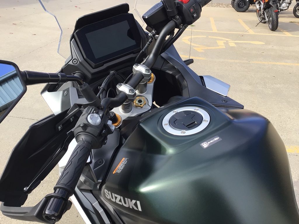 The accessory offerings include heated hand grips, low and premium seats, fuel tank and engine cover protectors, clip-on tank bags, plus a unique selection of Suzuki logo apparel.